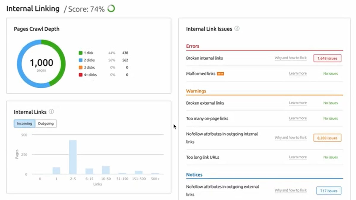 Run a site audit approximately once a month, and look over the internal linking report for any issues. The most straightforward approach to monitoring your site's health and making any necessary modifications is to do it this way.
